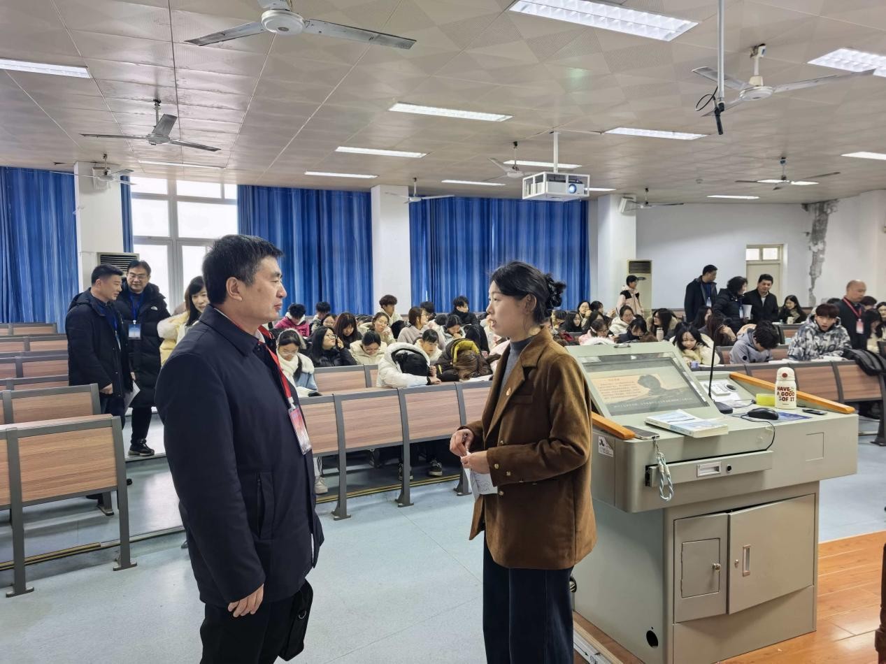 余本海一行在人文楼608教室听取了杨春艳老师主讲的《中国近现代史纲要》“导言”课。杨春艳遵循“是什么—为什么—怎么办”的教学思路,清新阐述了课程学习的必要性与重要性,备课充分、讲授生动、逻辑严谨、重点突出,有效调动了学生学习积极性。课后,余本海与授课教师亲切交流,对课堂教学效果给予充分肯定,并结合思政课育人目标,就优化教学方法、丰富教学案例、提升课堂吸引力等提出指导意见。他指出,思政课是落实立德树人根本任务的关键课程,希望思政课教师深耕教学、守正创新,全面提升教学质量,切实增强思政课育人实效。