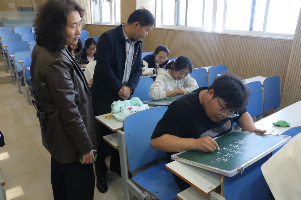 赛场上,选手们全神贯注、各展所长:挥毫泼墨,毛笔字沉稳厚重;执笔板书,粉笔字工整规范;伏案书写,钢笔字流畅舒展;精心勾勒,简笔画生动传神。学院领导与老师们认真观摩作品、与选手亲切交流。訾其伦副院长从笔法运用、结构布局、绘画构思等方面进行细致指导,强调“三笔一画”是师范生立身之本,也是传承中华优秀传统文化的重要载体,勉励同学们持之以恒、学以致用。沈海蓄老师鼓励大家注重细节打磨,养成规范书写的良好习惯。