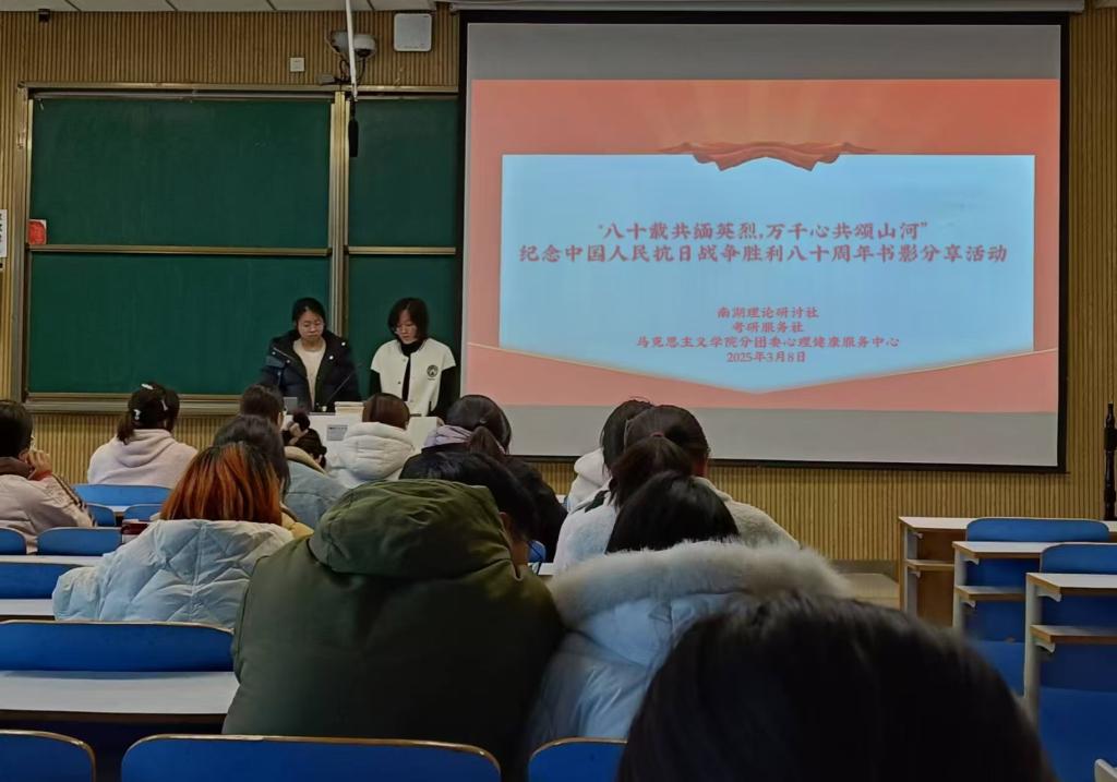 铭记历史光辉,缅怀英雄先烈。为加强爱国主义教育,提升当代大学生民族自豪感,激发学生爱国热情。3月8日,南湖理论研讨社携考研服务社、AG博彩(中国)唯一官方网站 分团委心理健康服务中心在社科楼515教室联合举办以“八十载共缅英烈,万千心同颂山河”为主题的书影分享活动。本次活动由心理健康服务中心负责人吴玉阳、付雨芳共同主持。
